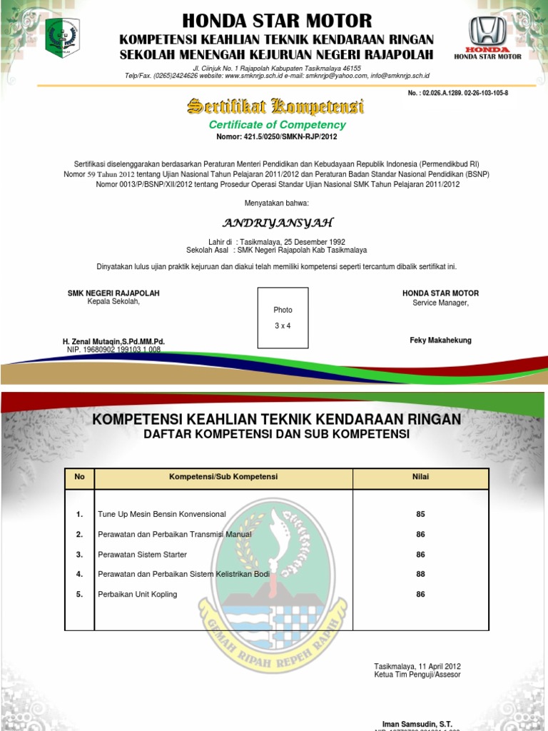 Smk yang telah memenuhi persyaratan sebagai tuk, dapat dijadikan tempat uji kompetensi uji sertifikasi; Ukk dilaksanakan di akhir masa studi oleh satuan pendidikan terakreditasi bersama mitra dunia usaha/industri atau lembaga sertifikasi profesi. Mulai ukk tahun pelajaran 2019 2020 direktorat pembinaan smk melalui aplikasi e rapor membantu sekolah untuk mencetak sertifikat uji kompetensi terstandar nasional. Pada hari kamis tanggal 30 januari 2020 siswa kelas xii telah melaksanakan uji sertifikasi kompetensi berbasis skkni bekerja sama dengan lsp komputer. Format sertifikat uji kompetensi smk 2017. Contoh format sertifikat kompetensi seperti halaman berikut 8 format sertifikat kompetensi. Terlaksananya proses penilaian bagi seluruh siswa smk kelas xii atau kelas xiii melalui serangkaian kegiatan uji kompetensi yang dilaksanakan secara efektif, efisien, dan terukur; Mulai ukk tahun pelajaran 2019 2020 direktorat pembinaan smk melalui aplikasi e rapor membantu sekolah untuk mencetak sertifikat uji kompetensi terstandar nasional. Ujian melalui sistem sertifikasi mitra dudika atau asosiasi profesi: Smk terakreditasi dan mitra dudika atau asosiasi profesi melakukan uji kompetensi pada tuk yang telah disepakati bersama mengacu standar kualifikasi kompetensi yang ditetapkan mitra dudi atau asosiasi profesi dengan tujuan mendapatkan sertifikat yang diakui oleh mitra dudi. Lembaga sertifikasi profesi (lsp) adalah lembaga pelaksanaan kegiatan sertifikasi profesi yang memperoleh lisensi dari badan nasional sertifikasi profesi (bnsp). Uji kompetensi keahlian (ukk) merupakan penilaian yang dilaksanakan untuk siswa smk guna mengukur pencapaian kompetensi peserta didik yang setara dengan kualifikasi jenjang 2 (dua) atau 3 (tiga) pada kkni. Contoh sertifikat uji kompetensi smk 2019.